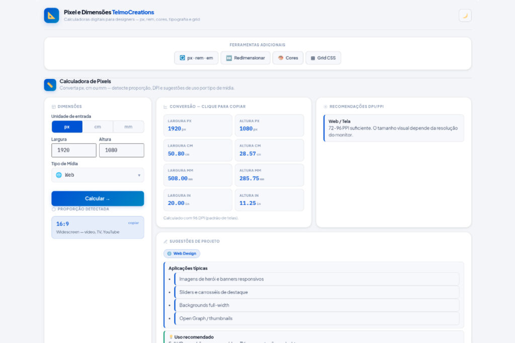 A Calculadora de Pixels do TelmoCreations foi desenvolvida para auxiliar na conversão de centímetros e milímetros para tamanhos digitais, como pixels, e também realizar o processo inverso. E com dias de onde aplicar.