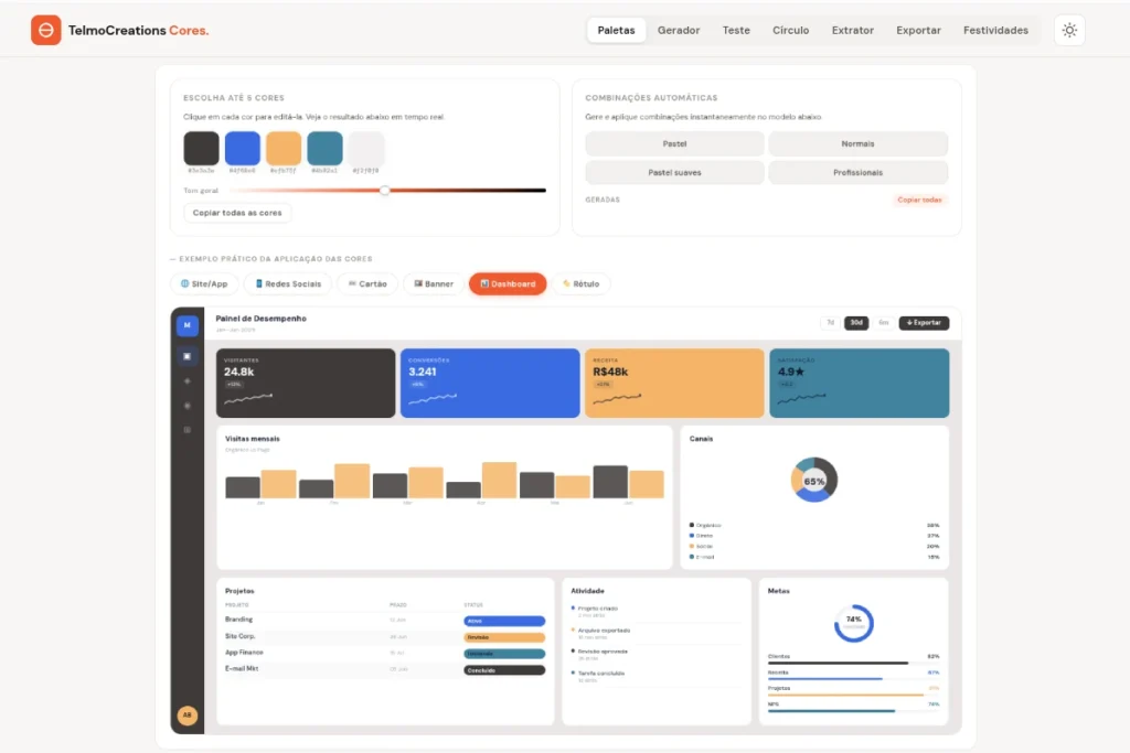 TelmoCreations Cores é uma ferramenta gratuita para designers gráficos e web designers explorarem, testarem e exportarem paletas de cores diretamente no navegador, sem cadastro, sem uploads, 100% local.