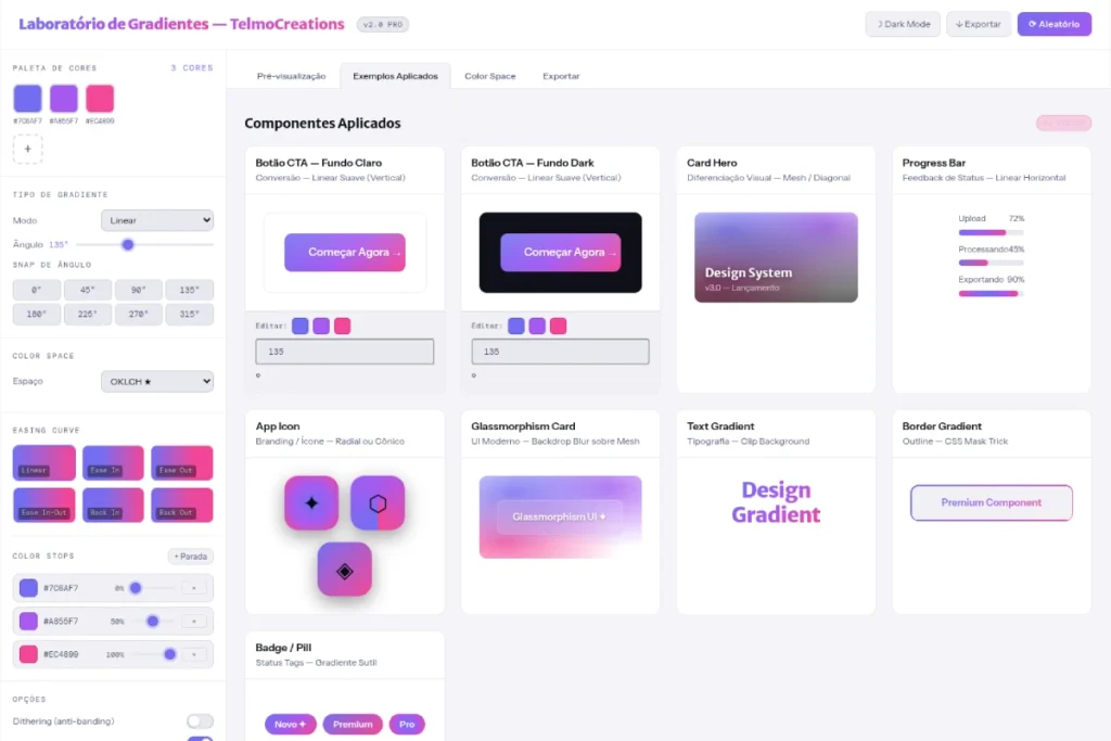 O Simulador de Gradientes da TelmoCreations testa suas cores em diversas simulações aplicadas a designs muito ultilizados no dia a dia, além de permitir a exportação das cores editadas para diferentes finalidades.