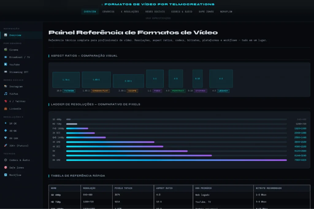O painel de resoluções de vídeos para editores, desenvolvido pelo TelmoCreation, foi pensando para ser um guia com dados minuciosos sobre como criar cada projeto em vídeo e renderizá-lo da melhor forma.
