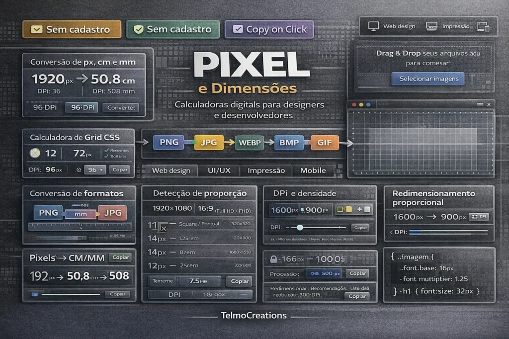 A Calculadora de Pixels do TelmoCreations foi desenvolvida para auxiliar na conversão de centímetros e milímetros para tamanhos digitais, como pixels, e também realizar o processo inverso. E com dias de onde aplicar.