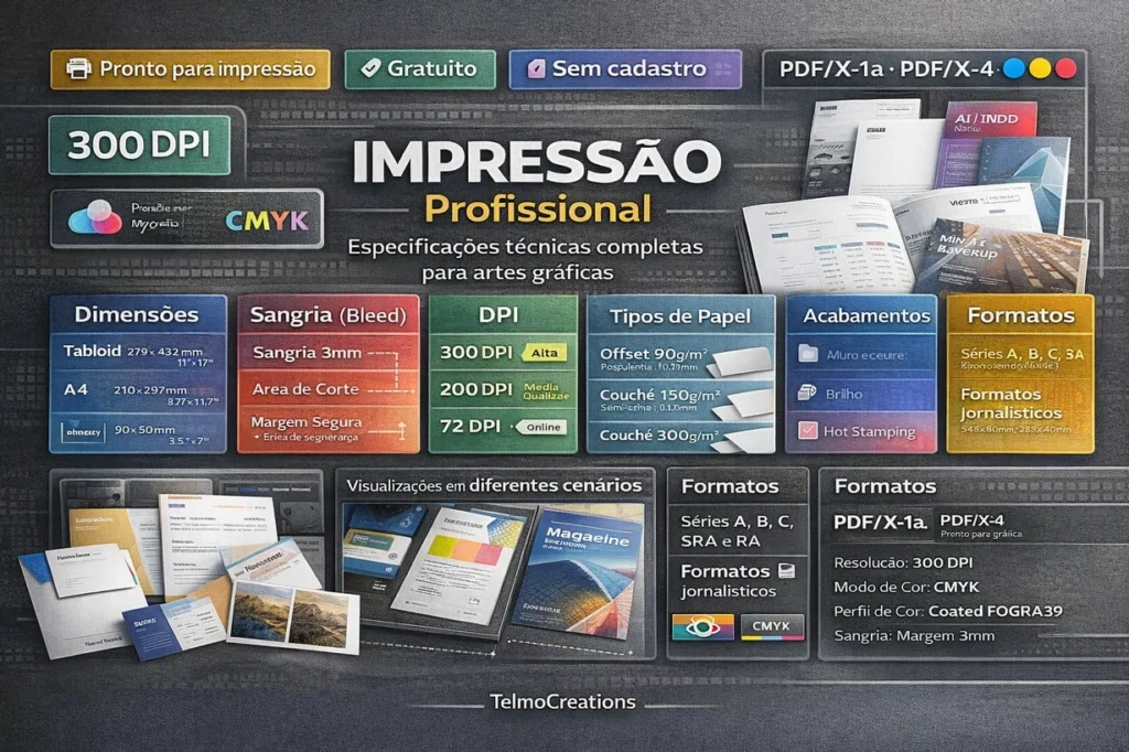 O Guia de Medidas para impressão do TelmoCreations foi pensado especialmente para quem trabalha com impressão em papel físico, seja A4, livro, cartão de visita e etc.. Reunindo medidas, sangrias e tipos de material corretos.