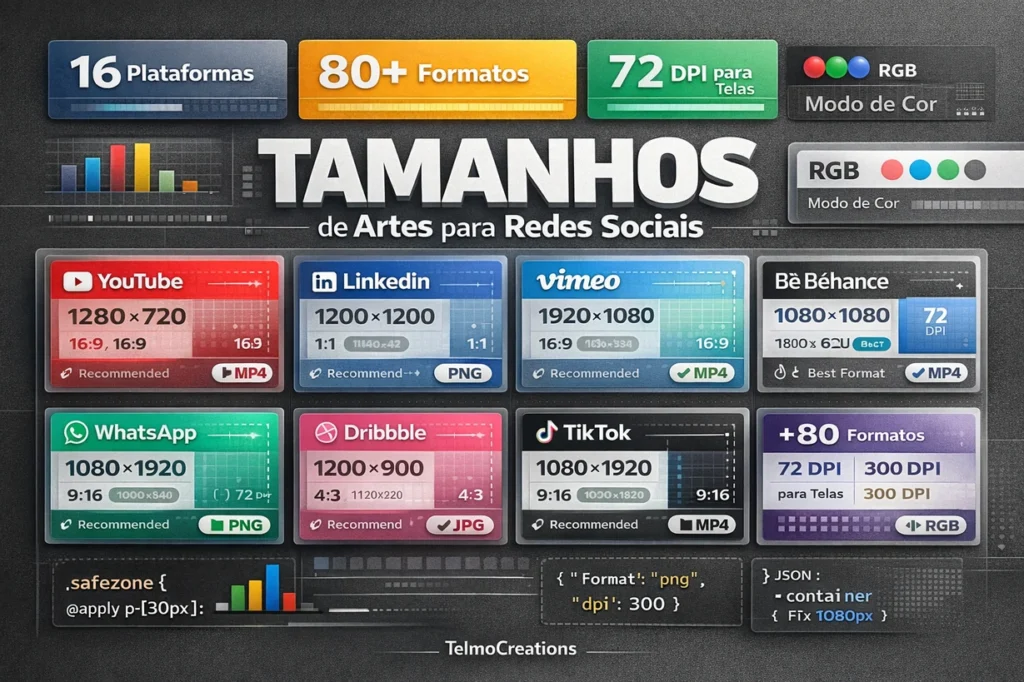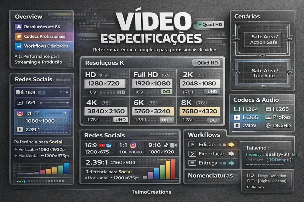 O painel de resoluções de vídeos para editores, desenvolvido pelo TelmoCreation, foi pensando para ser um guia com dados minuciosos sobre como criar cada projeto em vídeo e renderizá-lo da melhor forma.