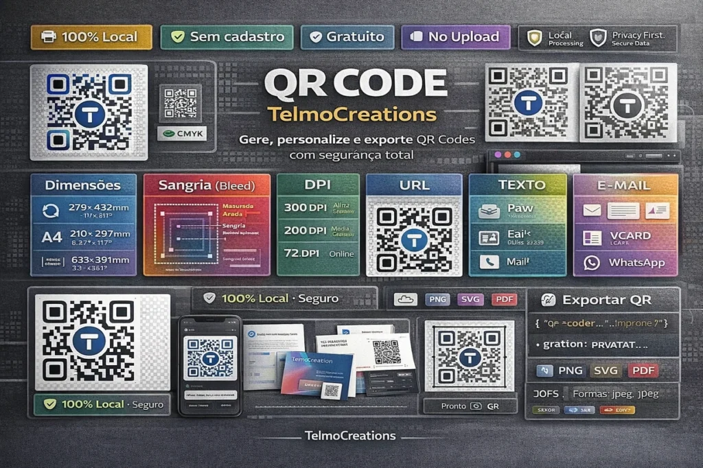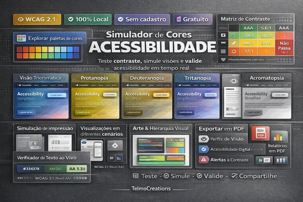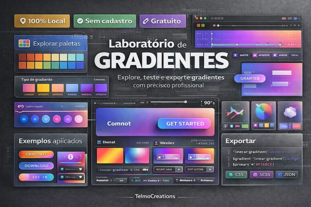 TelmoCreations Cores é uma ferramenta gratuita para designers gráficos e web designers explorarem, testarem e exportarem paletas de cores diretamente no navegador, sem cadastro, sem uploads, 100% local.